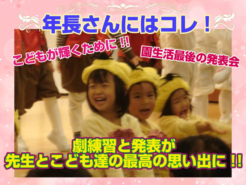 年長の担任の先生はもちろんのこと、年中・年少の担任や副担任、補佐の先生・・・卒園式はその先生方の「成長記念日」だと思います!!